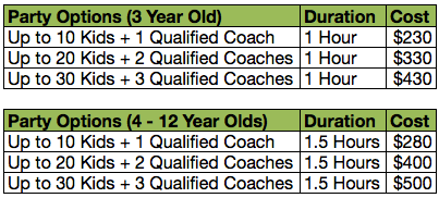 Additional charges apply for joint birthday parties and public holiday bookings.